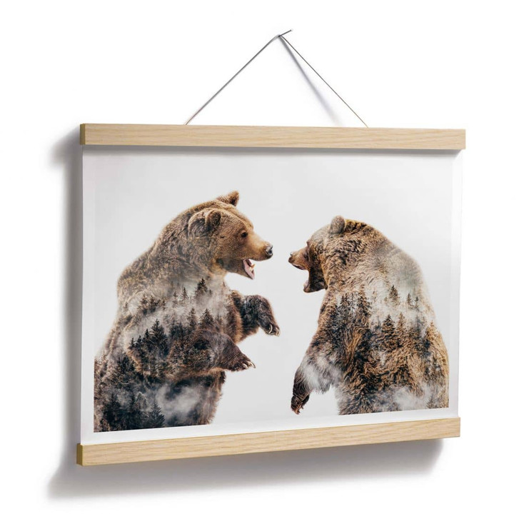 Möchtest du dein Zuhause optisch aufwerten? Mit diesem Poster setzt du im Handumdrehen neue Akzente in deinem Zimmer. Das Foto der Künstlerin Bea Angyalosi zeigt zwei wilde Braunbären. Sie haben sich auf die Hinterbeine gestellt und kämpfen gegeneinander. Durch die kunstvolle Mehrfachbelichtung ist in ihrem Fell ein Wald zu erkennen.