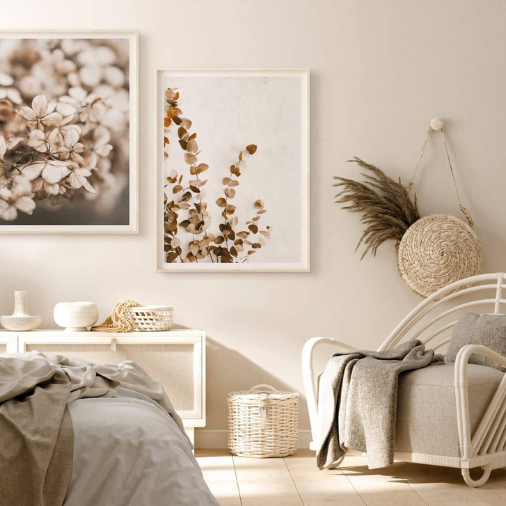 Das Foto zeigt getrocknete Eukalyptuszweige in zarten Erdtönen. Sie sind bekannt für ihre schöne Blattform und duften angenehm nach frischen Zitrusfrüchten. Hol dir ein Stück Botanik als dekoratives Bild nach Hause und schaffe dir einen Ort zum Entspannen. Das Beste daran: Pflanzenmotive eignen sich für alle Räume. Am Eingang, in der Küche, im Wohnbereich oder sogar in Büros sorgen die naturgetreuen Bilder für entspannte Stunden und setzen frische Akzente an der Wand. Ideal für alle, die nicht unbedingt einen grünen Daumen haben. Viel Spass beim Dekorieren!