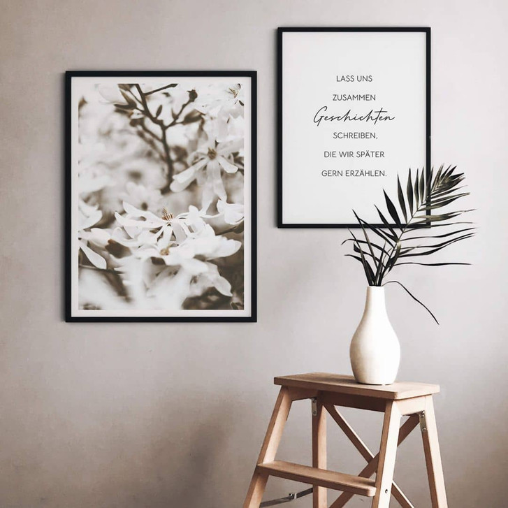 - Montagevorschläge: Tesa Tacks, Washi Tape, Posterleiste aus Eichenholz, hochwertige Posterklemmen aus Metall oder Bilderrahmen