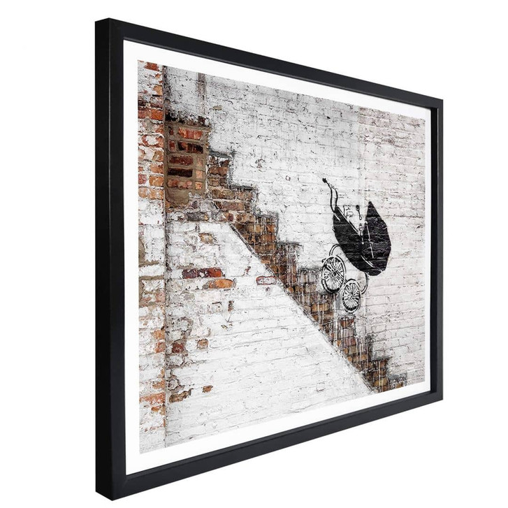 Bereichere dein Zuhause mit Originalbildern und schaffe einen gemütlichen Ort, an dem du über die Welt nachdenken kannst. Schmücke deine leeren Wände mit den gesellschaftskritischen Graffitis des berühmten Strassenkünstlers Banksy. Das Poster zeigt einen Kinderwagen, der von selbst eine alte Treppe hinunterfährt. Banksy kritisiert die Nachlässigkeit von Eltern, die ihren Kindern nicht genug Aufmerksamkeit schenken.