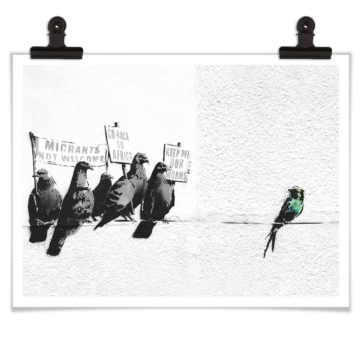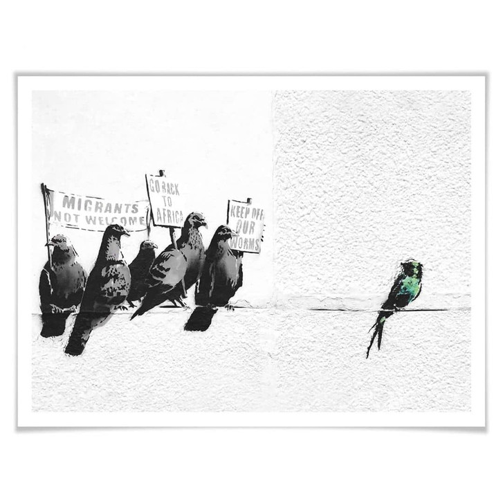 Bereichere dein Zuhause mit Originalbildern und schaffe einen gemütlichen Ort, an dem du über die Welt nachdenken kannst. Schmücke deine leeren Wände mit den gesellschaftskritischen Graffitis des berühmten Strassenkünstlers Banksy. Das Poster zeigt graue Tauben, die mit Pappschildern protestieren. Ihre Demonstration richtet sich gegen einen bunten Vogel aus Afrika.