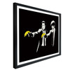 Bereichere dein Zuhause mit Originalbildern und schaffe einen gemütlichen Ort, an dem du über die Welt nachdenken kannst. Schmücke deine leeren Wände mit dem gesellschaftskritischen Graffiti des berühmten Strassenkünstlers Banksy. Das „Pulp Fiction“-Poster zeigt eine berühmte Szene aus dem Kultfilm. Das Gemälde entstand 2003 in London und wurde 2007 zerstört. Die Darstellung der beiden Auftragskiller Vincent Vega und Jules Winnfield machte John Travolta und Samuel L. Jackson weltberühmt. Banksy ersetzt die beiden Pistolen durch Bananen. Die leuchtend gelbe Farbe der Bananen ist das einzige Highlight in der ansonsten monochromen Komposition.