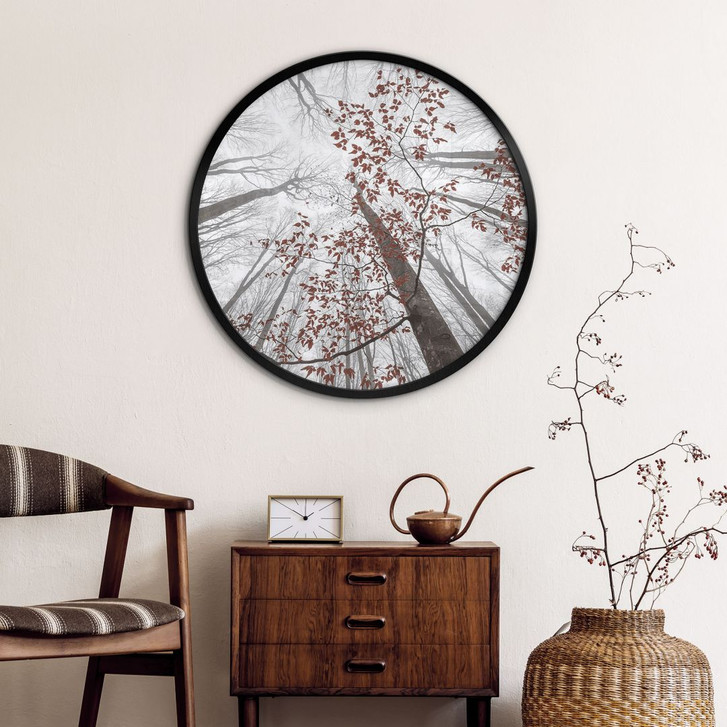 Zuhause ist es doch am schönsten. Deshalb ist es besonders wichtig, eine schöne Umgebung zu haben, in der man sich wohlfühlt. Das Poster „Baumkronen mit roten Blättern“ vermittelt ein Gefühl von Ruhe und Gelassenheit. Wenn man das Motiv betrachtet, kann man sich leicht vorstellen, wie man auf dem Waldboden liegt und den Blick nach oben zu den Bäumen geniesst. Die Bäume sind kahl, nur einige rote Herbstblätter zeigen ihre schönen Farben und trotzen der kalten Jahreszeit. Dieses beruhigende Waldmotiv ist wohltuend für die Seele und genau das Richtige, um sich nach einem langen Tag zu entspannen. Dieses runde Poster ist ein echter Hingucker für dein Zuhause. Es ist schnell aufgehängt und schafft mit wenig Aufwand ein stilvolles Ambiente, das zum Wohlfühlen einlädt.