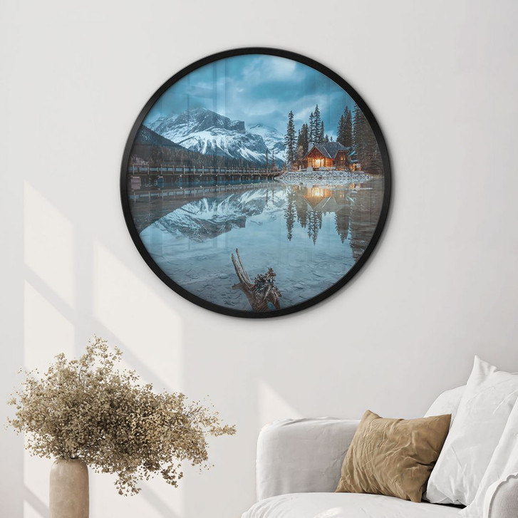 Dieses runde Poster fängt die unvergleichliche Ruhe und Erhabenheit des Emerald Lake im Yoho-Nationalpark in Kanada ein. Das warme Licht der kleinen Hütte am Ufer steht im Kontrast zu dem kühlen, tiefen Blau des Sees und des Himmels, das sich in der umgebenden Natur widerspiegelt. Die schneebedeckten Berge im Hintergrund und die dichten Wälder verleihen der Szene eine beeindruckende Tiefe und Erhabenheit.