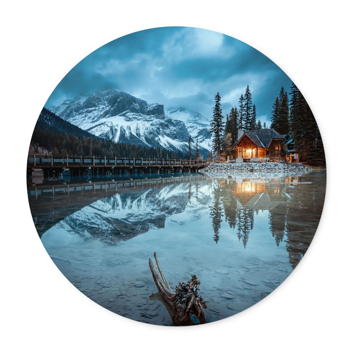 Dieses runde Poster fängt die unvergleichliche Ruhe und Erhabenheit des Emerald Lake im Yoho-Nationalpark in Kanada ein. Das warme Licht der kleinen Hütte am Ufer steht im Kontrast zu dem kühlen, tiefen Blau des Sees und des Himmels, das sich in der umgebenden Natur widerspiegelt. Die schneebedeckten Berge im Hintergrund und die dichten Wälder verleihen der Szene eine beeindruckende Tiefe und Erhabenheit.