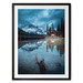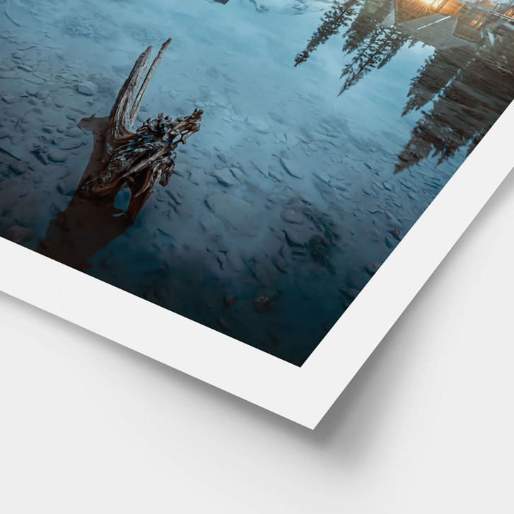 Dieses Poster zeigt die idyllische Abenddämmerung am Emerald Lake im Yoho-Nationalpark in Kanada. Eine einsame Hütte am Seeufer strahlt warmes Licht aus und bildet einen harmonischen Kontrast zu den kühlen Blautönen von Himmel und Wasser. Die majestätischen Berge und dichten Wälder spiegeln sich in der glatten Oberfläche des Sees und schaffen eine fast magische Atmosphäre.