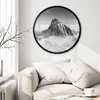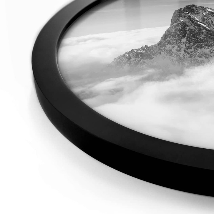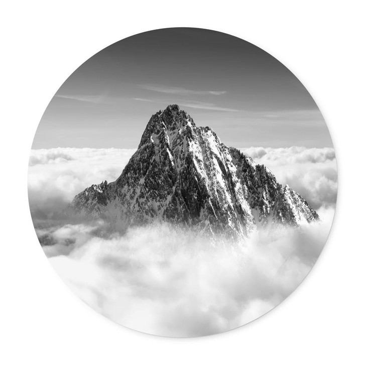 Dieses runde Poster fängt die faszinierende Szenerie eines schneebedeckten Berggipfels ein, der sich stolz über einem Wolkenmeer erhebt. Die kontrastierenden Schwarz- und Weisstöne verleihen der Szene eine zeitlose Eleganz und betonen die mächtigen Felsstrukturen sowie die weichen, nebelartigen Wolken. Der Anblick vermittelt ein Gefühl von Ruhe und Erhabenheit, das zum Verweilen und Träumen einlädt.