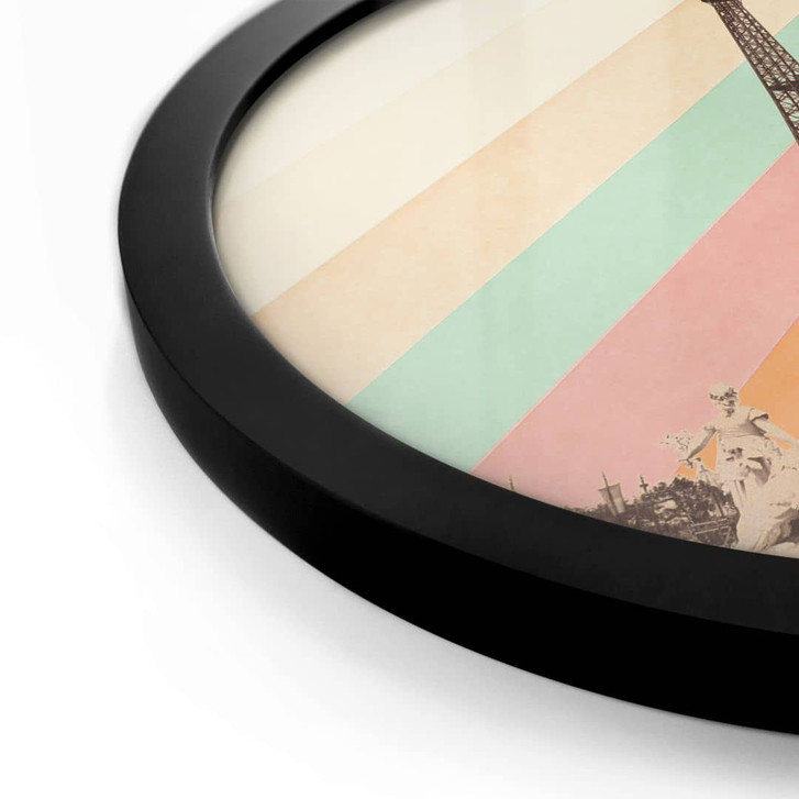 Mache mehr aus deinem Zuhause und ziehe mit diesem runden Poster die Aufmerksamkeit auf deine Wand! Die Fotokunst von Bodart entführt dich in die Stadt der Liebe. Im Zentrum des Vintage-Bildes steht imposant und hoch der Eiffelturm. Im Hintergrund setzen eine grosse gelbe Sonne und ein gestreifter Regenbogen farbenfrohe Akzente.