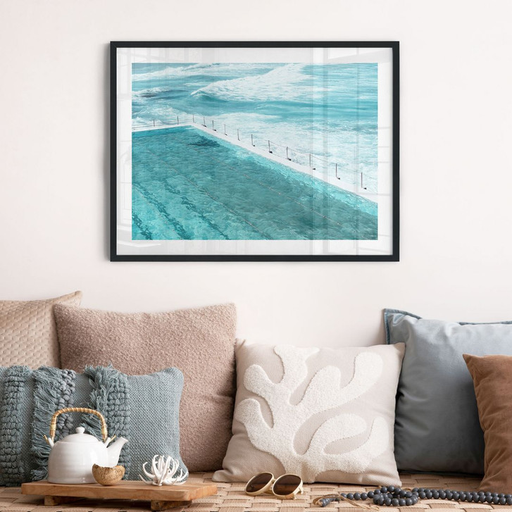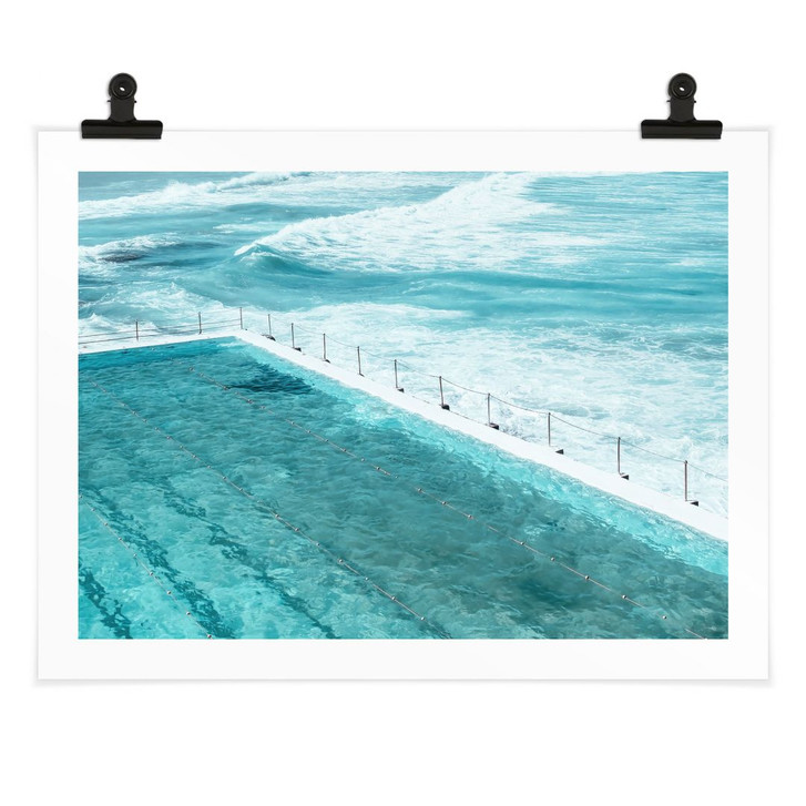 Das ruhige Wasser des Pools trifft auf die Dynamik des Meeres. Typisch für Australiens berühmtesten Sandstrand, Bondi Beach, ziehen zuverlässige Wellen Surfer aus aller Welt an. Der ruhige Pool hingegen lässt nur erahnen, dass sich nebenan entspannte Badegäste, Spaziergänger und Jogger auf dem Küstenpfad und in den umliegenden Cafés tummeln. Und das nur, wenn man den Ort kennt. Trotz der Abwesenheit von Menschen und Tieren gibt dieses Foto einen fantastischen Einblick in die Gegensätze von Bondi Beach. Ein gekonntes Meisterwerk des zeitgenössischen Künstlers ByeEye, dessen Arbeiten sich durch lebendige und ausdrucksstarke Stücke auszeichnen.