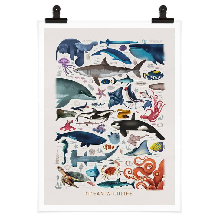 Spielen, lesen, schlafen – der Spielbereich ist der wichtigste Ort für jedes Kind. Hier können sich die Kleinen frei entfalten und wachsen. Und damit sie sich rund um die Uhr wohlfühlen, dürfen stilvolle Dekorationselemente nicht fehlen. Mit diesem Poster des Illustrators Dieter Braun zauberst du eine spannende Tierwelt ins Kinderzimmer. Es zeigt verschiedene Meeresbewohner – von Walen, Haien und Delfinen über Schildkröten und Pinguine bis hin zu Fischen, Seepferdchen und Muscheln. Die Tiere sind mit ihren englischen Namen beschriftet.