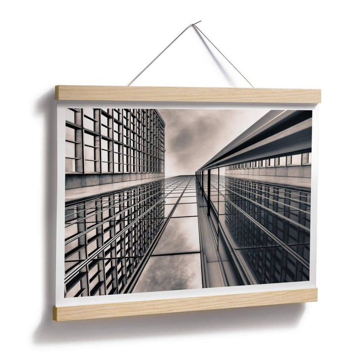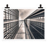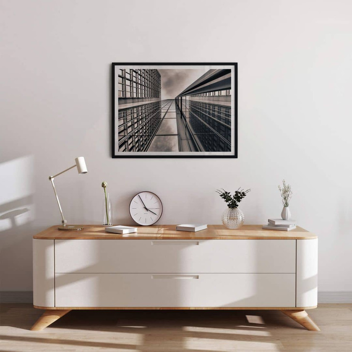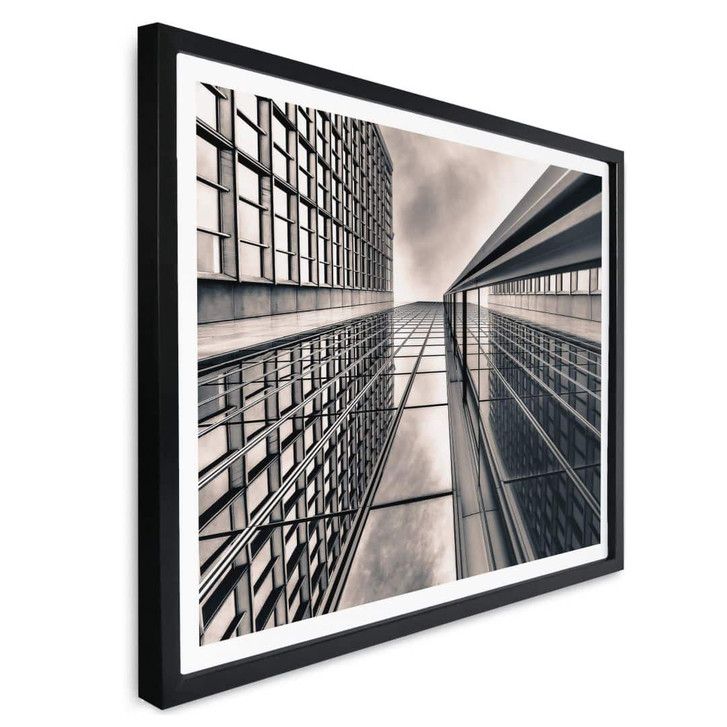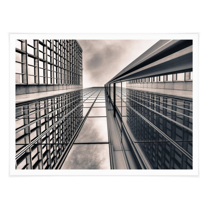 Mehr als nur eine Gebäudefassade: Das ausdrucksstarke Fotomotiv besticht durch lineare Strukturen und den Farbkontrast in Schwarz-Weiss. Die Froschperspektive macht die Aufnahme zu einem echten Hingucker.