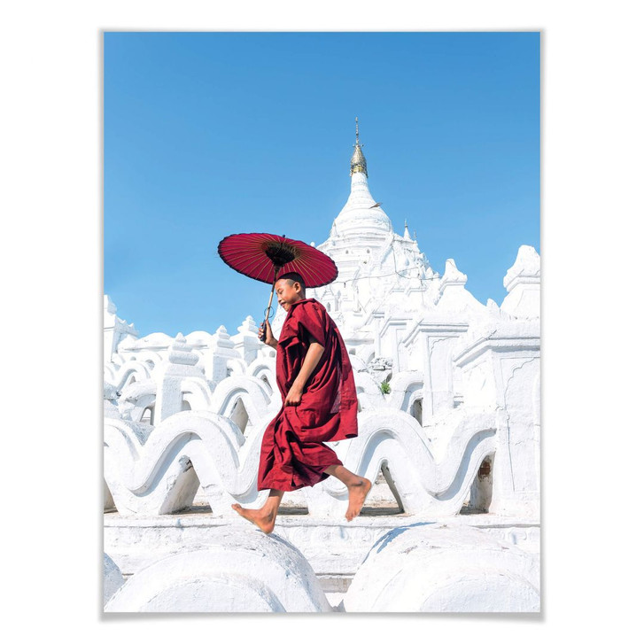 Im Fernen Osten ist ein Mönch gut gelaunt und tanzt auf dem Tempelgelände. Es ist ein schöner, sonniger Tag, an dem alles möglich ist. Die Botschaft ist klar: Lächle mehr, denke positiv und nutze den Tag! Gute Laune ist ansteckend – sei der Erste, der Freude verbreitet. Matteo Colombos fröhliches Motiv lässt die Sonne in deinem Herzen und an deiner Wand scheinen!