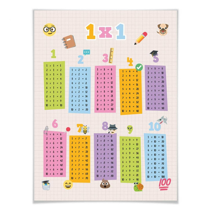 Das Kinderposter „Das kleine 1 x 1“ verbindet Lernen mit einem hohen Spassfaktor. Das farbenfrohe Design hilft Kindern, das Rechnen mit dem Einmaleins leicht zu verstehen und schnell zu erlernen. Ob im Kinderzimmer, Klassenzimmer oder als süsse Geschenkidee für Schulanfänger – dieses lustige Lernposter verbindet Lernen mit Spass und Spiel.