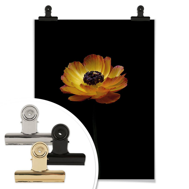 Ranunkeln gibt es in einer Vielzahl leuchtender Farben – hier haben wir eine, die in einem satten Gelb erblüht ist. Sie hat rote Highlights am äusseren Rand der Blüten. Die leuchtenden Frühsommerblüher bilden einen schönen Kontrast zum schwarzen Hintergrund und sehen aus wie ein Licht in der Dämmerung. Entdecke viele weitere Blumenmotive in unserem Shop und lass den Frühling herein!