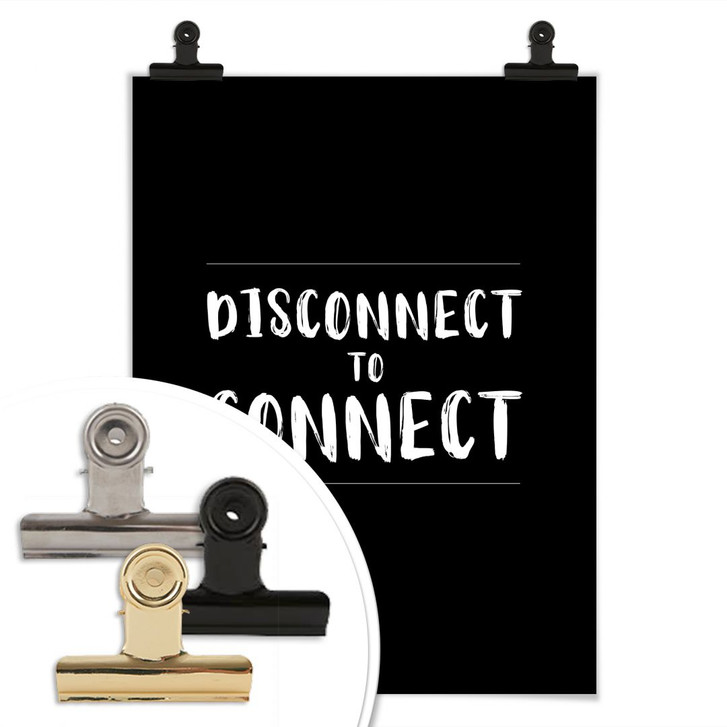 Das schwarze Poster mit der weissen Aufschrift „Disconnect to connect“ ist ein Hingucker an der Wand. Der Spruch, mit der Aufforderung, sich nicht von der Technik das Leben diktieren zu lassen, ist als Poster in verschiedenen Grössen erhältlich. Die Wandbefestigung kannst du gleich mitbestellen!