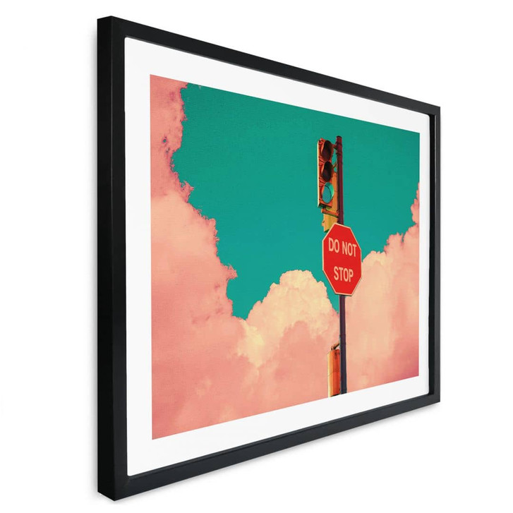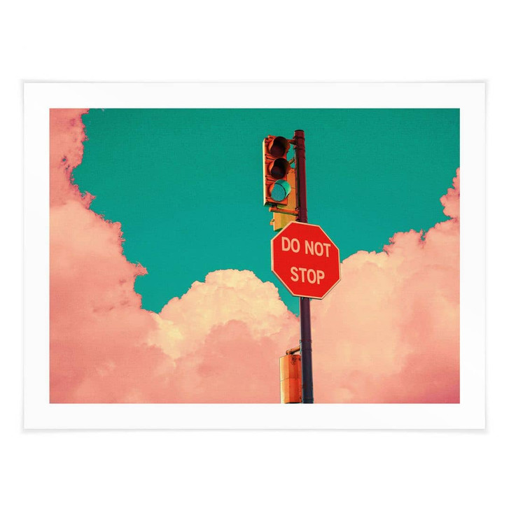 Verwandle deinen Wohnbereich in einen Ort der Ruhe, an dem du es dir mit unseren modernen Motiven gemütlich machen kannst. Die Fotokunst des Künstlers CosmoZach fängt ein wunderschönes Naturschauspiel mit rosa Wolken am türkisfarbenen Himmel ein. Die grüne Ampel und das Verkehrsschild „DO NOT STOP“ sind eine tägliche Motivation, deine Ziele zu erreichen und weiterzumachen.