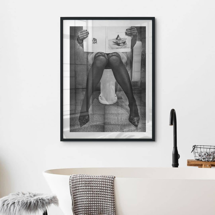 Das Badezimmer ist ein Ort der Diskretion und absoluten Privatsphäre. Das Foto des Fotokünstlers Toniolo zeigt gekonnt ein spannendes Wechselspiel ambivalenter Frauenbilder in diesem Umfeld. Eine durch und durch stilbewusste, hübsche Frau sitzt auf der Toilette, gekleidet in provokante Spitzenstrumpfhalter und Stilettos, während sie in ein Rezeptbuch vertieft ist. Unwiderstehlich weiblich, multitaskingfähig und gleichzeitig die perfekte Hausfrau? Ein ideales Spiel mit den typischen Stereotypen einer Frau in Schwarz-Weiss. Das Motiv ist perfekt für deine Lieblingsecke im Badezimmer.