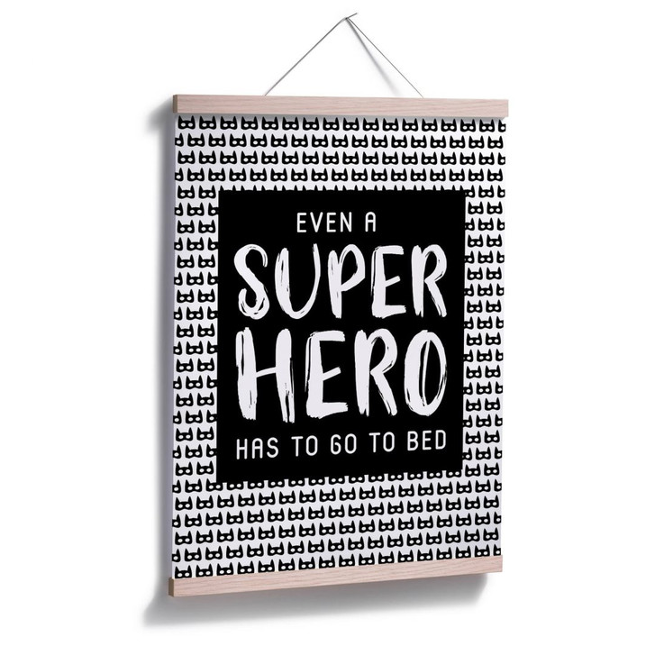 Das Poster mit der weissen Aufschrift „Auch ein Superheld muss mal ins Bett“ ist ein Hingucker an der Wand. Auch Superhelden müssen mal ins Bett! Das Poster mit den vielen kleinen Superheldenmasken im Hintergrund ist in verschiedenen Grössen erhältlich. Die Wandhalterung kannst du gleich mitbestellen!