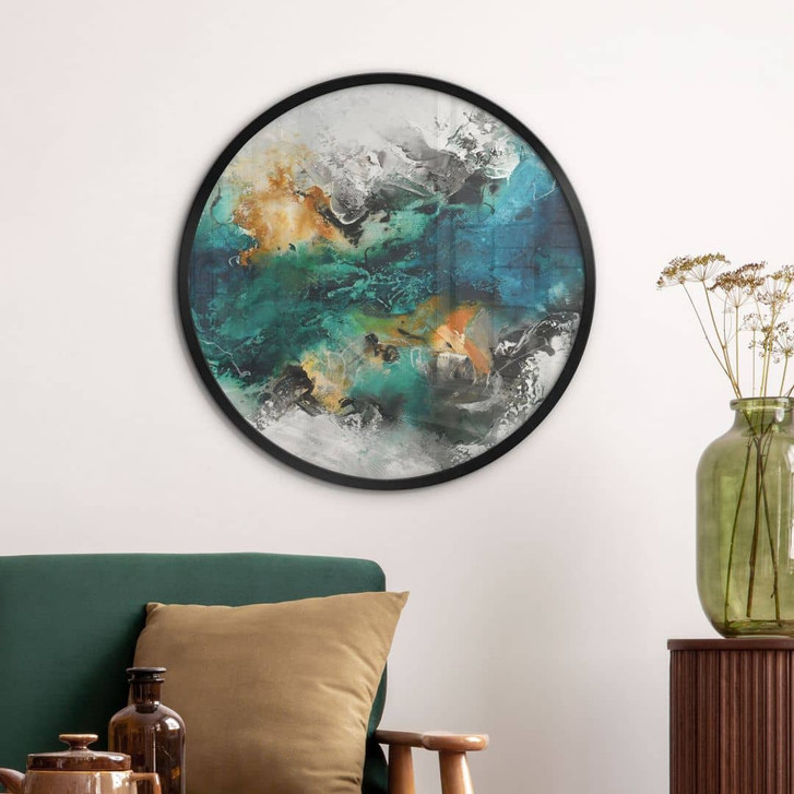 Dieses beeindruckende Kunstwerk kombiniert kräftige Blautöne, leuchtendes Orange und tiefes Schwarz zu einer dynamischen Farbexplosion. Die fliessenden Strukturen und harmonischen Kontraste erzeugen eine aussergewöhnliche Tiefe, die den Betrachter in eine Welt voller Bewegung und Emotionen entführt. Das runde Format verleiht dem Motiv eine besonders moderne und stilvolle Optik.