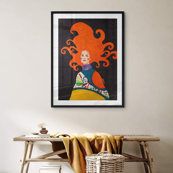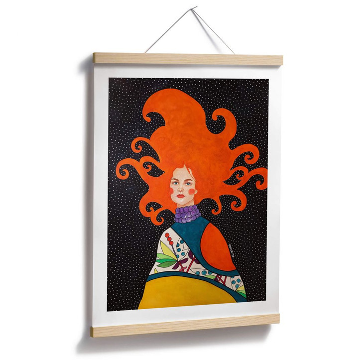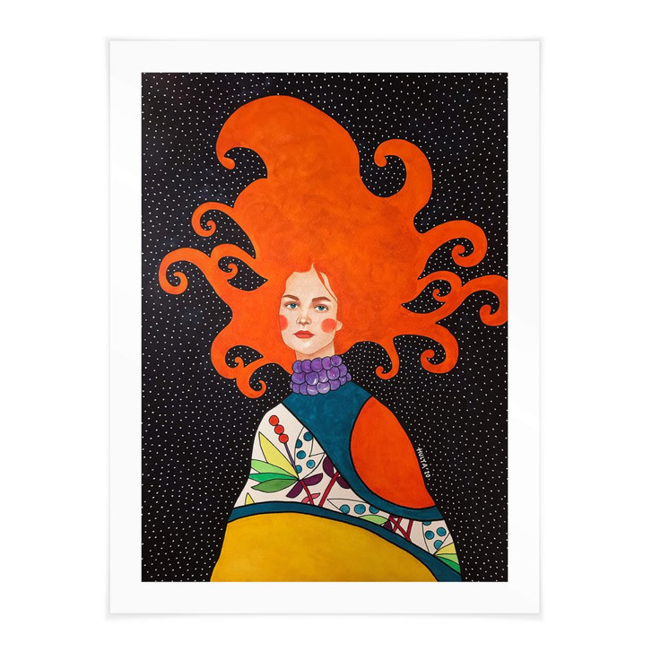 Du suchst nach besonderen Dekorationen für deine Räume? Bei trenddeko.ch findest du die passende Wandkunst für viele verschiedene Räume und Einrichtungsstile. Der farbenfrohe Kunstdruck von Hülya zeigt das Porträt einer jungen Frau. Ihre leuchtend roten Haare bilden einen intensiven Kontrast zum schwarzen Hintergrund.