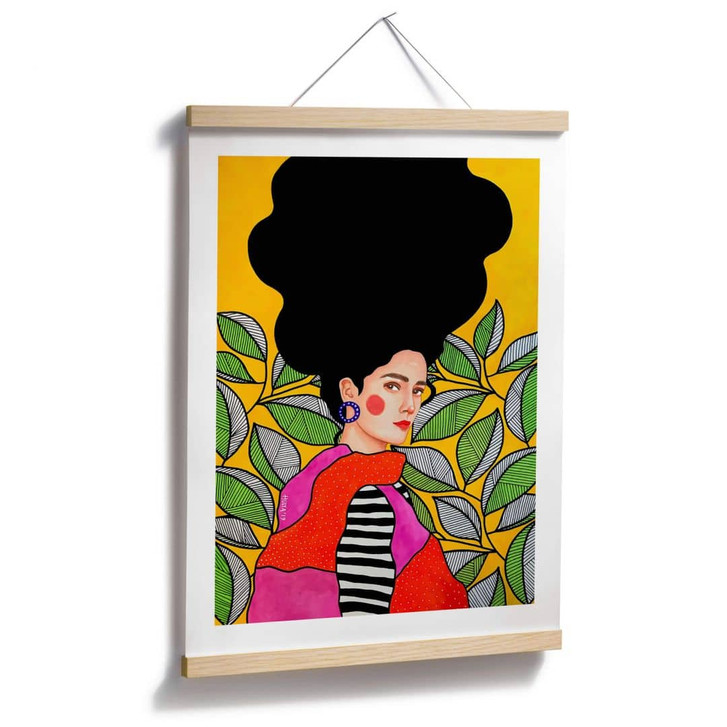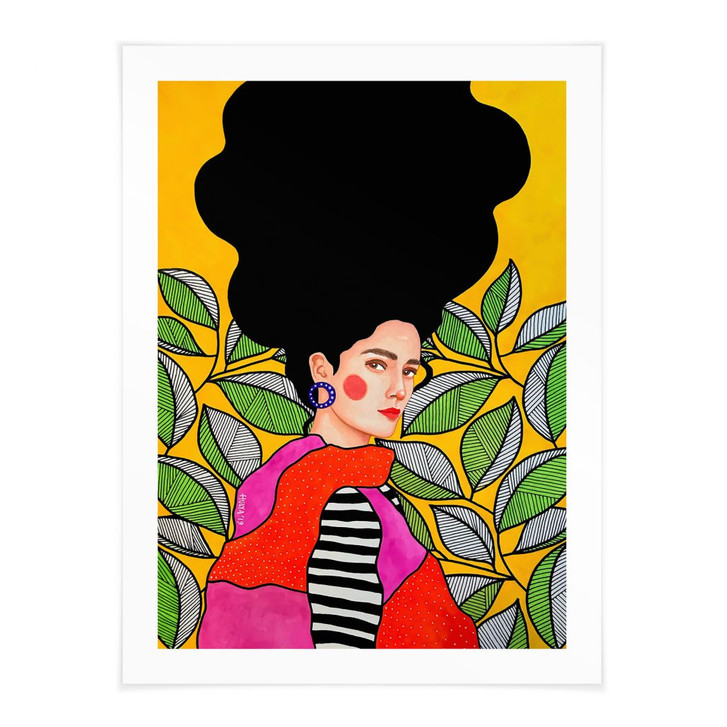 Du suchst nach einer besonderen Möglichkeit, dein Zuhause zu dekorieren? Bei trenddeko.ch findest du die passende Wandkunst für viele verschiedene Räume und Einrichtungsstile. Der farbenfrohe Kunstdruck von Hülya zeigt das Porträt einer jungen Frau mit schwarzen Haaren. Sie blickt den Betrachter über ihre Schulter an. Es scheint, als würde sie sich gleich umdrehen und durch die grün-weissen Blätter einer grossen Pflanze verschwinden.