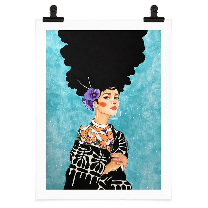 Hast du deinen eigenen Stil? Mit unserem Wandaccessoire kannst du ihn harmonisch zur Geltung bringen. Verleihe deinem Wohnbereich eine unverwechselbare Atmosphäre. Der farbenfrohe Kunstdruck von Hülya zeigt eine Frau mit einem Turm aus schwarzen Haaren. Sie trägt einen schwarz-weissen Umhang und eine lila Blume im Haar.