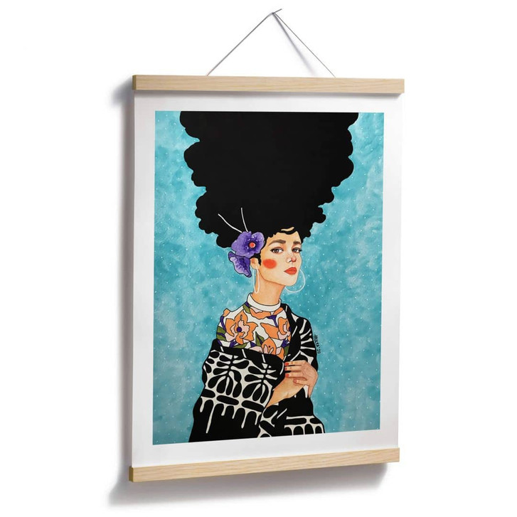 Hast du deinen eigenen Stil? Mit unserem Wandaccessoire kannst du ihn harmonisch zur Geltung bringen. Verleihe deinem Wohnbereich eine unverwechselbare Atmosphäre. Der farbenfrohe Kunstdruck von Hülya zeigt eine Frau mit einem Turm aus schwarzen Haaren. Sie trägt einen schwarz-weissen Umhang und eine lila Blume im Haar.