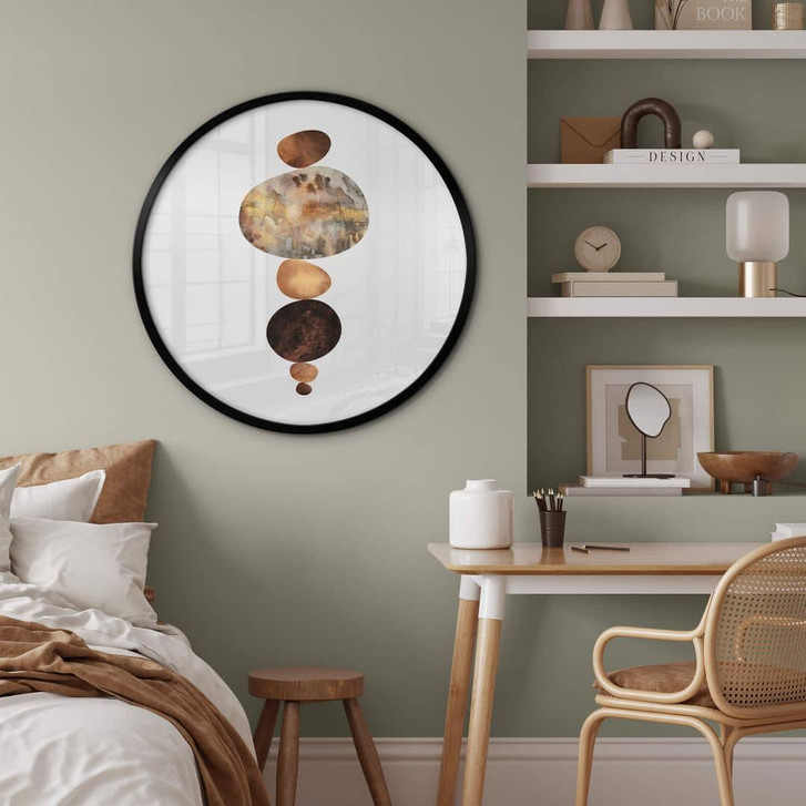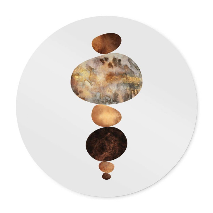 Wer sagt, dass Wandkunst rechteckig sein muss? Verabschiede dich von den klassischen Standardformaten und bringe mit einem runden Poster frischen Wind an deine Wand! Dieser Kunstdruck von Elisabeth Fredriksson, der einen Turm aus Steinen darstellt, wird dir garantiert beim Entspannen helfen. Sie sehen aus wie unterschiedlich grosse Steine, die aufeinander gestapelt sind und versuchen, das Gleichgewicht zu halten. Mit seinen Brauntönen und dem goldenen Glitzereffekt wirkt das Bild stilvoll und elegant.