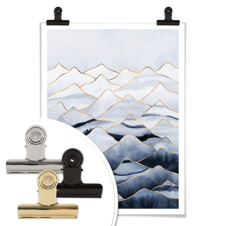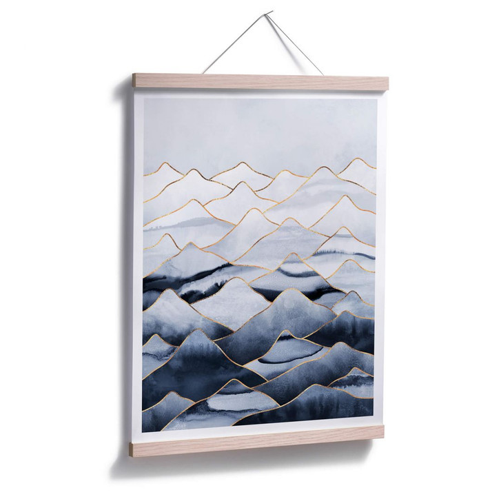 Das abstrakte Bild der Berge ist in kühlen Blautönen gehalten. Der Farbübergang ist fliessend von hell nach dunkel. Die einzelnen Berge sind mit goldfarbenen Linien markiert und verleihen dem Bild einen Hauch von Glamour. Verschönere deine Räume mit kreativen und innovativen Motiven von Elisabeth Fredriksson!