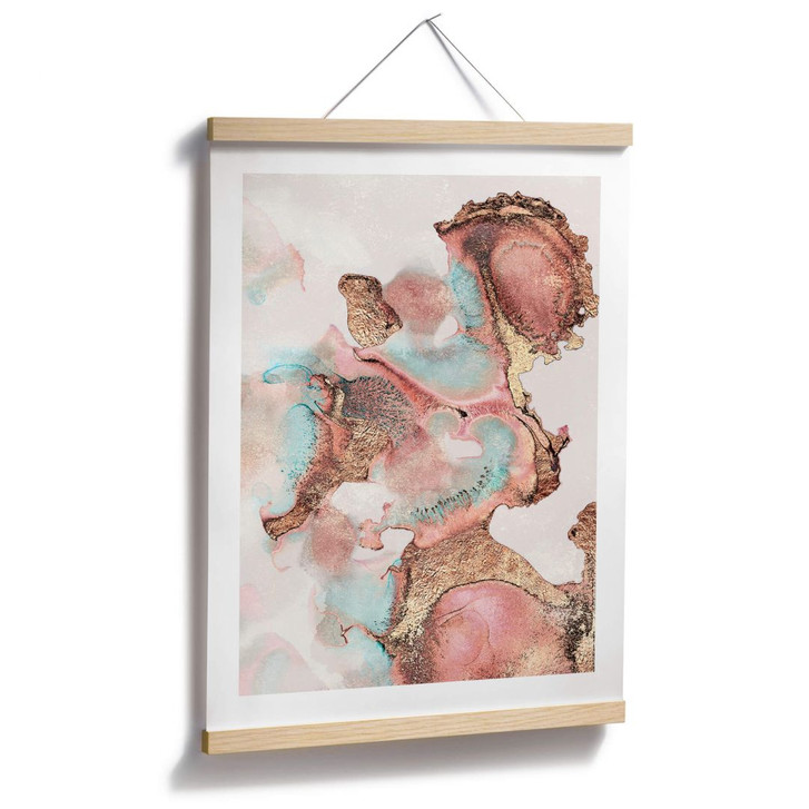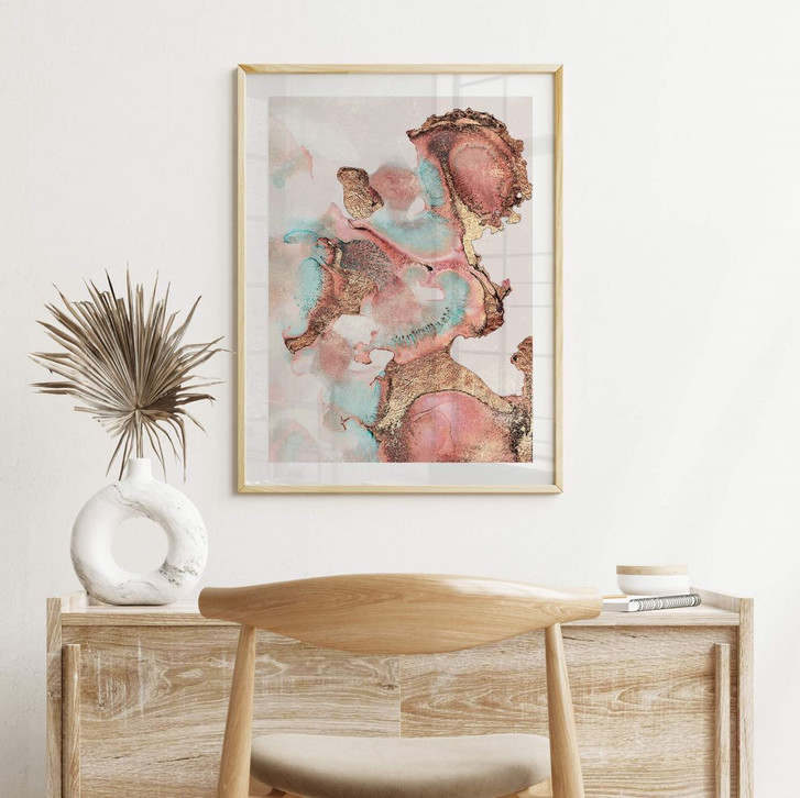 Abstrakt, geometrisch oder klassisch? Kunst ist innovativ und vielseitig. Finde den Stil, der zu dir passt! Und diese Illustration versprüht positive Vibes. Die abstrakte Kunst von Elisabeth Fredriksson zeigt flüssige Tinte in den Farbtönen Rosa, Gold und Mint. Die fliessende Tinte erinnert an ein Marmormuster. Die Farben Rosa und Mint wirken sommerlich und frisch, während der Goldton für einen Hauch von Wärme und Glamour sorgt. So entsteht ein farbenfrohes Kunstwerk, das der Wand einen besonderen Look verleiht. Das moderne Wandbild kannst du mit anderen Motiven von Fredriksson kombinieren, um beispielsweise eine trendige Wandgestaltung im skandinavischen Stil zu kreieren.