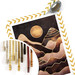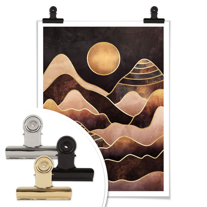 Die warmen Farben Gold und Braun dominieren das abstrakte Bild des Sonnenuntergangs. Im Mittelpunkt steht die golden schimmernde Sonne, umgeben von den wellenförmigen Bergen, die das Motiv dekorativ gestalten. Verschönere deine Wände mit kreativen und innovativen Designs von Fredriksson!