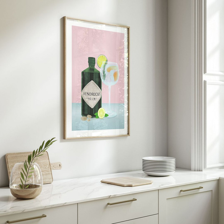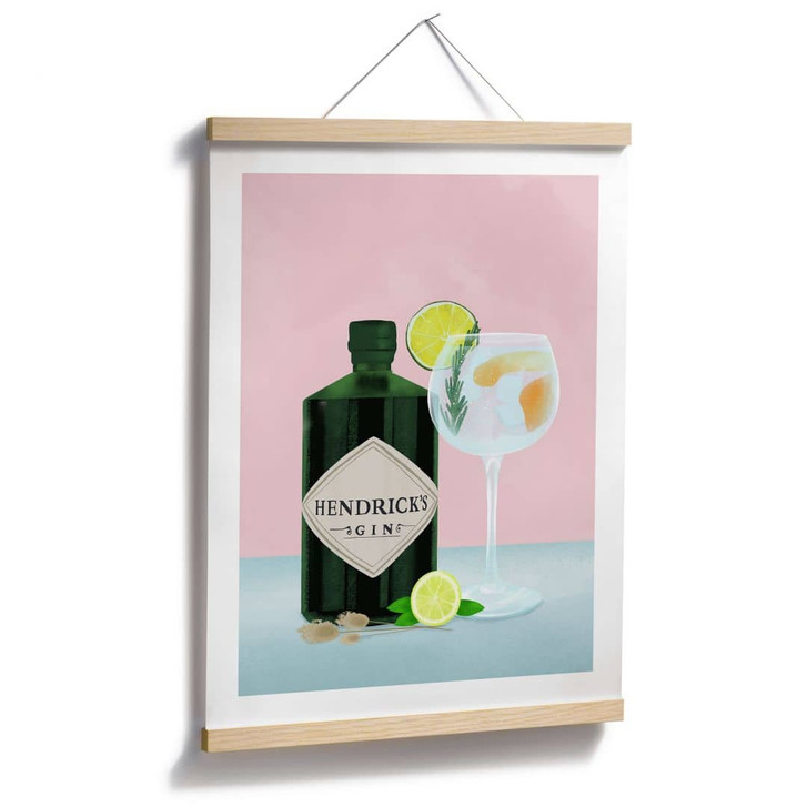 Das Poster zeigt eine detaillierte Illustration einer Hendrick's Gin-Flasche neben einem perfekt servierten Gin Tonic. Die lebendigen Farben und feinen Details, wie die Limettenscheibe, der Rosmarinzweig und die Eiswürfel im Glas, verleihen dem Bild eine realistische und einladende Atmosphäre. Der zartrosa Hintergrund sorgt für einen modernen und stilvollen Look, der jeden Raum aufwertet und eine angenehme Atmosphäre schafft.