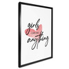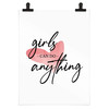 Lust auf neue Farben? Dieses Wandbild „Mädchen können alles“ ist ein farbenfroher Hingucker für deine Wand. Lass dich jeden Morgen von dem Typografie-Poster mit schwarzer Schrift und rosa Herzen motivieren und inspirieren.