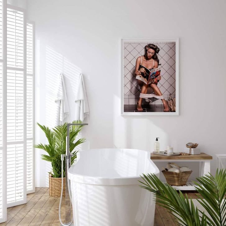 Das Badezimmer ist ein Ort der Diskretion und absoluten Privatsphäre. Es ist ein Zentrum für Gesundheit und Schönheit. Hier beginnt die morgendliche Routine. Das Badezimmer wird immer mehr zu einem Raum des Komforts und der Gemütlichkeit. Vom Duschen und Zähneputzen über die Toilettenbenutzung bis hin zum Schminken und Schaumbad: Hier ist man ganz für sich allein und fühlt sich danach erfrischt, entspannt, frisch und schön. Das Foto des belgischen Fotografen Jeannot Magneto Stahl (kurz gNo) zeigt ein modernes Frauenporträt. Die hübsche Frau mit den Lockenwicklern sitzt auf der Toilette und vertieft sich in eine Zeitschrift. Unwiderstehlich weiblich und multitaskingfähig – ein perfektes Motiv für deine Lieblingsecke im Badezimmer.