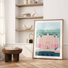 Mit viel Liebe zum Detail hat die Künstlerin Petra Lizde die unverwechselbare Symmetrie und Farbgebung eingefangen, die den Film so einzigartig machen. deine moderne, stilisierte Interpretation bewahrt die Magie des Originals und verleiht dem Motiv eine zeitlose Eleganz. Die ausgewogene Kombination aus zartem Rosa, tiefem Blau und zartem Grün schafft ein harmonisches Gesamtbild, das sowohl klassische als auch moderne Wohnräume bereichert.