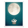 Eine wunderbare, klare Nacht, in der drei weisse Kaninchen glücklich in einem Korb am Mond hängen. Der Mond sieht aus wie ein Heissluftballon und trägt die Kaninchen mit sich herum. Da wünscht man sich doch, selbst im Korb zu sitzen und die wunderbare Nacht zu geniessen.