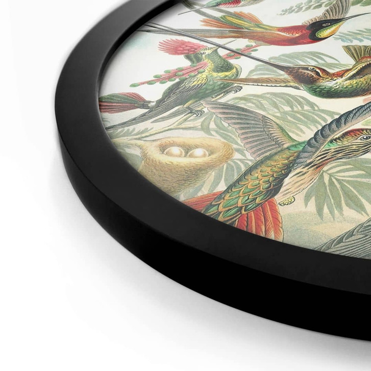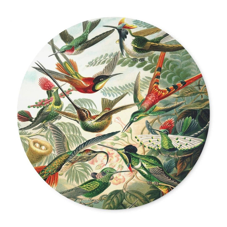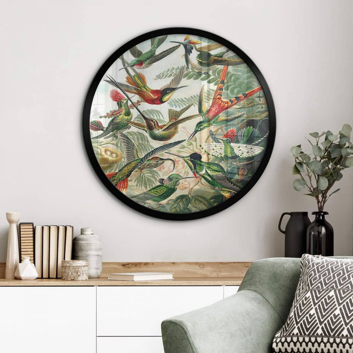 Wer sagt, dass Wandkunst immer rechteckig sein muss? Verabschiede dich von den klassischen Standardformaten und bringe mit einem runden Poster frischen Wind in dein Zuhause! Dieser Kunstdruck von Haeckel ist ein farbenfroher Hingucker an der Wand. Kolibris gehören zu den kleinsten Vögeln der Welt und besitzen die Fähigkeit, rückwärts zu fliegen. Dieser sogenannte „Schwalbenschwanzflug“ wird sonst nur von Bienen, Libellen und anderen Insekten beherrscht. Die tropischen Vögel begeistern mit ihrem farbenfrohen Gefieder in schimmernden Metallic-Farben und sind trotz ihrer geringen Grösse ein wunderschöner Blickfang.