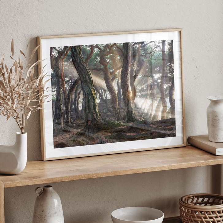 Hol dir die magische Ruhe des Waldes nach Hause und lass dich von einem Kunstwerk inspirieren, das Natur und Stil perfekt vereint. Dieses Motiv zeigt einen geheimnisvollen Kiefernwald, durch den zarte Sonnenstrahlen in goldenem Licht fliessen und die knorrigen Baumstämme in eine fast surreale Schönheit tauchen. Die ineinander verwobenen Wurzeln und üppig grünen Baumkronen erzählen von der zeitlosen Anmut der Natur. Die harmonische Farbpalette und die lebendigen Details schaffen eine Atmosphäre der Ruhe, Tiefe und natürlichen Eleganz und verwandeln jeden Raum in eine Wohlfühloase.