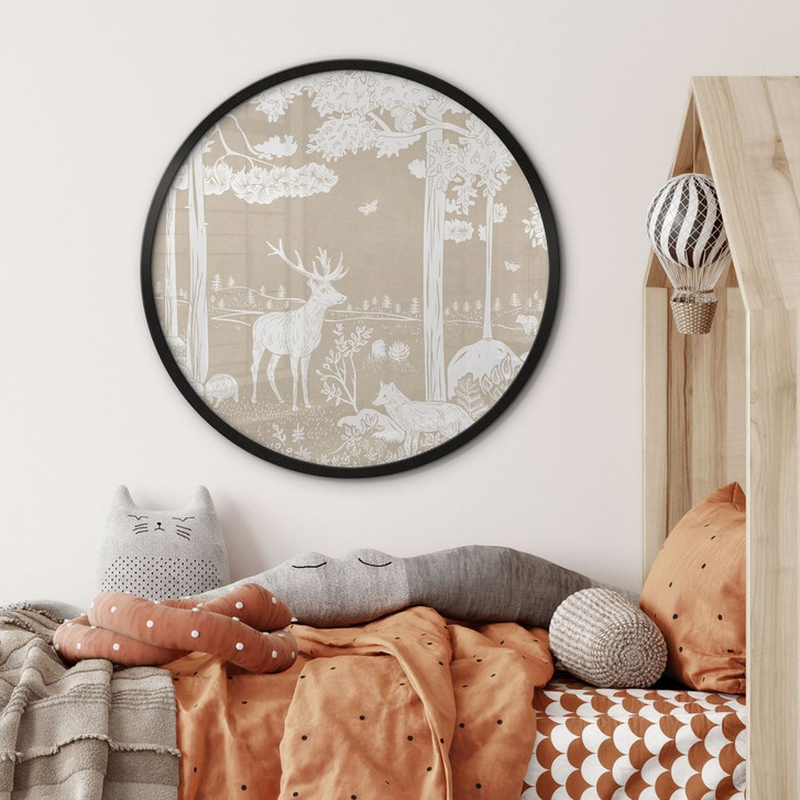 Eine harmonische Waldszene für das Kinderzimmer in einem eleganten runden Rahmen