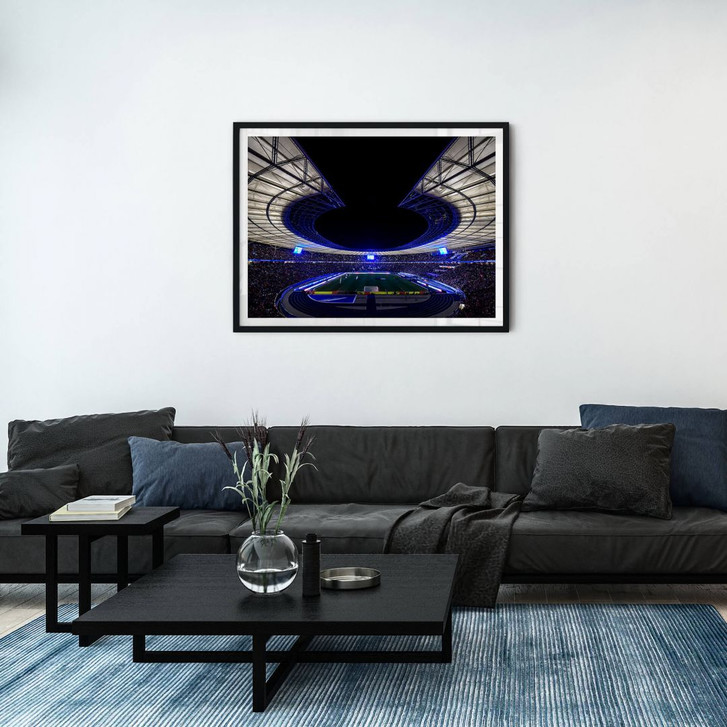 Für einen echten Fussballfan gibt es nichts Besseres, als im Stadion selbst zu sein und seine Lieblingsmannschaft anzufeuern. Das Gefühl, mit anderen Fans zusammenzukommen, um mit Schlachtrufen und Fangesängen zu feiern, ist einzigartig und sorgt für Gänsehaut. Und mit diesem Wandbild kannst du dir genau dieses aufregende Gefühl an die Wand hängen. Für Hertha-Fans ist das Berliner Olympiastadion der „Heilige Rasen“. Das meisterhafte Bauwerk befindet sich im Olympiapark in Berlin Charlottenburg. Hier finden die Heimspiele des Fussballvereins Hertha BSC statt und der Austragungsort bietet über 74.000 Sitzplätze. Bei diesem Motiv kannst du täglich bei Nacht den Innenbereich des gigantischen Stadions bewundern. Besonders magisch wirkt der Fussballplatz im Dunkeln. Hol dir das Fotomotiv aus der Sportreihe nach Hause und schaffe mit wenigen Handgriffen Berliner Fussballflair!