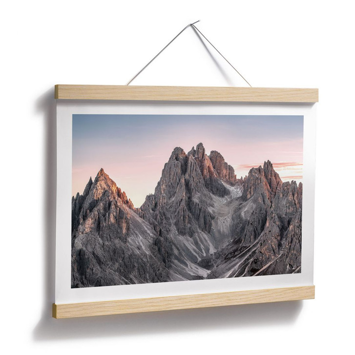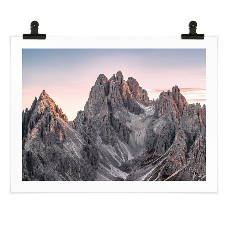 Entdecke die neuesten Trends und gestalte dein Zimmer mit unserer Wandkunst! Die Fotografie von Ariel Ling raubt dem Betrachter den Atem. Sie zeigt eine beeindruckende Ansicht einer Berglandschaft. Im Hintergrund geht die Sonne auf.