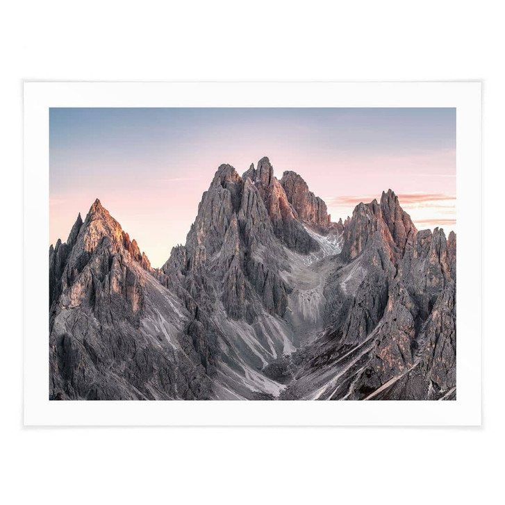 Entdecke die neuesten Trends und gestalte dein Zimmer mit unserer Wandkunst! Die Fotografie von Ariel Ling raubt dem Betrachter den Atem. Sie zeigt eine beeindruckende Ansicht einer Berglandschaft. Im Hintergrund geht die Sonne auf.