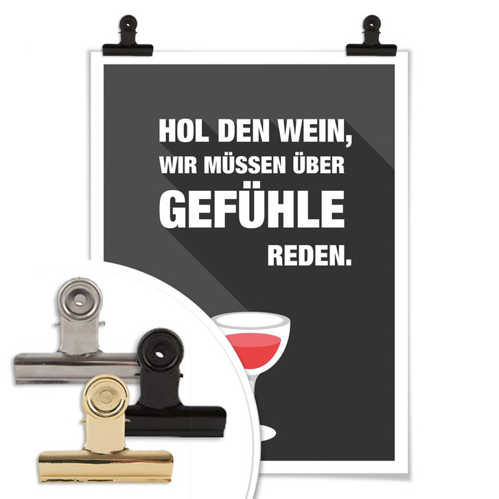 Es ist nicht immer einfach, offen über Gefühle zu sprechen. Manchmal kann ein Glas Wein helfen, die Zunge zu lösen. Das ist die Botschaft auf diesem Poster, auf dem steht: „Hol den Wein, wir müssen über Gefühle reden“. Mit diesem witzigen Spruch schaffst du einen echten Hingucker an deiner Wand und zeigst gleichzeitig deinen Sinn für Humor. Das klare, schnörkellose Design passt gut in ein modernes Wohnumfeld und lässt sich in den Farben Schwarz, Rot und Weiss mit verschiedenen Einrichtungsfarben kombinieren. Das Poster ist in verschiedenen Grössen und Formaten erhältlich und passt auf jede Wandfläche. Es bringt Humor und Dekoration in deine Wohnräume – und vielleicht fällt es dir ein bisschen leichter, über deine Gefühle zu sprechen, wenn du es ansiehst ... Setze auf eine witzige Wanddekoration mit einem flotten Spruch, der zu den unterschiedlichsten Situationen passt! Du erhältst ein Poster in hochwertiger, robuster Qualität, das sich an die Wand kleben, anpinnen oder sogar in einen Rahmen hängen lässt.