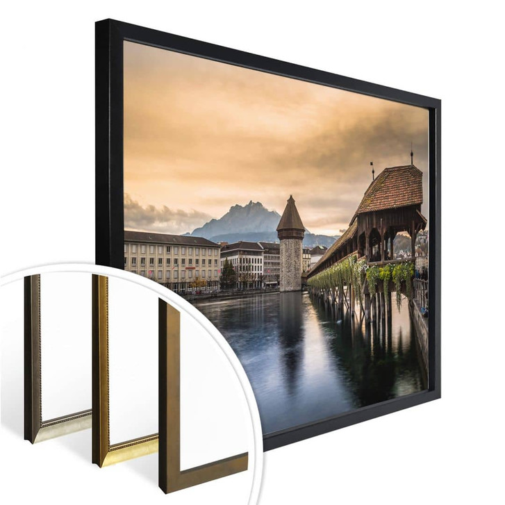 Lass dich von diesem Bild in eine unbeschwerte Wohlfühlzone entführen! Die Fotokunst ist ein überraschender Blickfang. Fotograf Florian Huber nimmt dich mit auf eine grosse Reise nach Basel. Dieses Motiv aus der Serie Städte & Reisen weckt dein Fernweh. Das Poster bietet einen schönen Blick auf die Kapellbrücke in Luzern. Sie überquert den Fluss Reuss, der die Alt- und die Neustadt trennt. Der berühmte Wasserturm auf der Brücke und der Pilatus im Hintergrund sind gut zu erkennen.