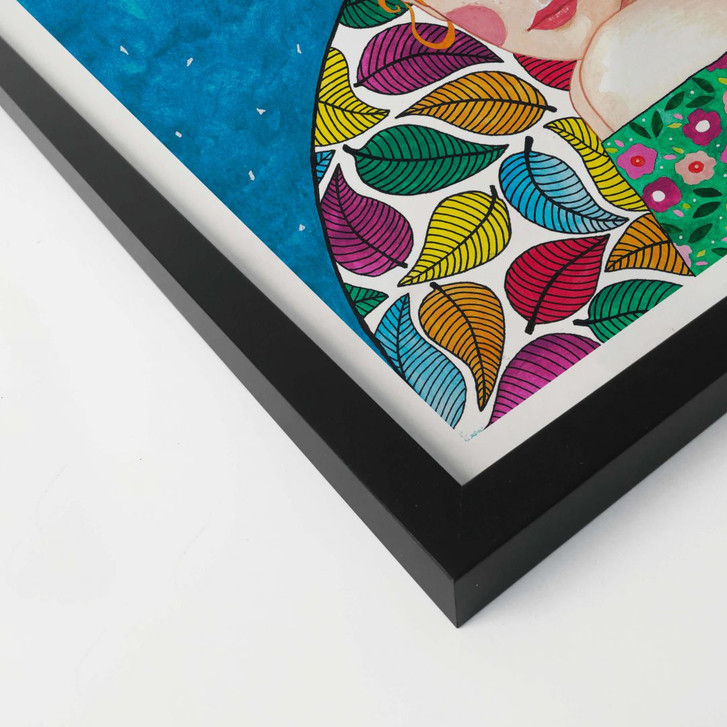 Diese Frau mit orangefarbenem Haar trägt eine bunte Blümchenbluse, die eine kleine Biene anlockt. Die Künstlerin Hülya Özdemir malt Frauenporträts in verschiedenen Farben und Posen, aber immer farbenfroh und kreativ. Mit Hülyas Kunstwerken setzt du definitiv ein farbenfrohes Highlight an deiner Wand und lässt den Raum lebendig wirken.