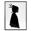 Die junge Frau, ganz in Schwarz gekleidet und mit entschlossenem Gesichtsausdruck, hat Federn im hochgesteckten Haar.