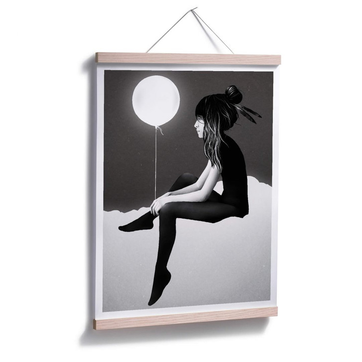 Eine junge Frau schwebt auf einer Wolke und hält einen leuchtenden Ballon in der Hand, der wie eine Lampe in der Dunkelheit wirkt.
