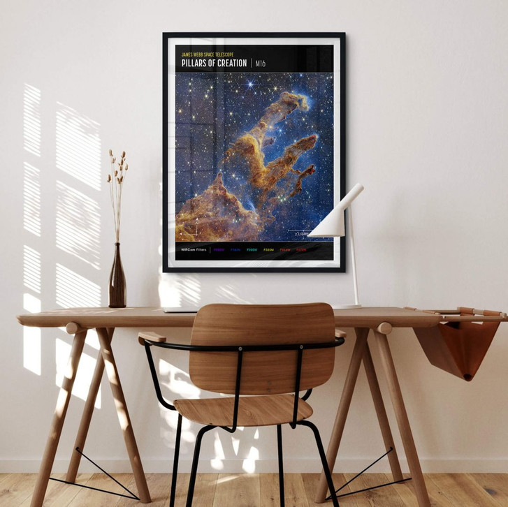 Zaubere mit diesem Wandbild ein trendiges Wohnerlebnis und gib deinen Wänden das passende Outfit. „Säulen der Schöpfung“ ist der Name einer Formation im etwa 7000 Lichtjahre entfernten Adlernebel. Das Bild wurde im Oktober 2022 mit dem Weltraumteleskop aufgenommen. Das NIRCAM enthüllt mit seiner gestochen scharfen Auflösung und beispiellosen Empfindlichkeit Hunderte von zuvor verborgenen Sternen und sogar zahlreiche Hintergrundgalaxien.