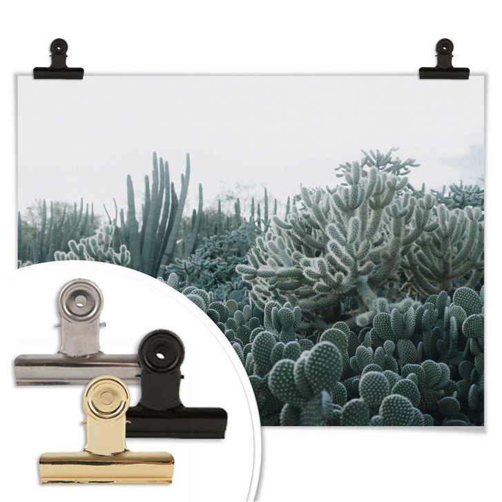 Nur anschauen – nicht anfassen? Nicht mit uns... Ein ganzes Feld unterschiedlichster Kakteen sonnt sich hier im ersten Tageslicht . Ob als Hintergrundmotiv für ein paar echte Kakteen oder einfach nur zur Inspiration, im Gegensatz zu den stacheligen Originalen kannst du dieses Poster problemlos anfassen und dieses faszinierende Naturmotiv in dein Dekorationskonzept aufnehmen.