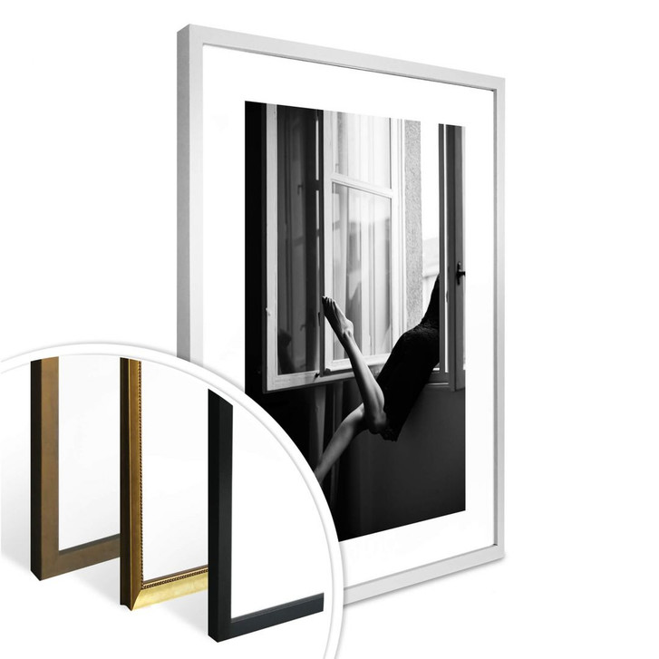 Eine Frau schaut neugierig aus dem Fenster und hebt ein Bein. Sie scheint amüsiert von dem, was draussen passiert. Mit Schwarz-Weiss-Fotografien kannst du eine stilvolle und elegante Wandgestaltung erzielen. Lass deiner Fantasie freien Lauf und kombiniere sie mit anderen attraktiven Motiven aus unserem Shop!